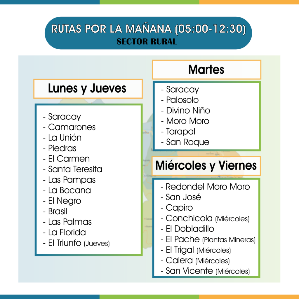 RECOLECTOR 3 | Camal Municipal Mercado Central Cdla. La Florida Sitio El Recuerdo Sitio la Cruz Barrio San Jacinto Cdla. San Roquito Cdla. La Inmaculada Sitio Tahuín Sitio Amarillos Sitio Guayacán Sitio Lozumbe Parroquia San Roque (vía a Guayabal solo hasta el puente, y centro médico) | Martes |