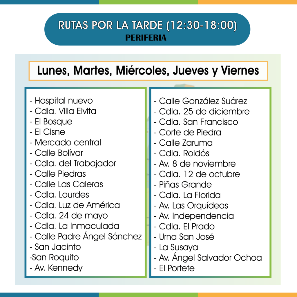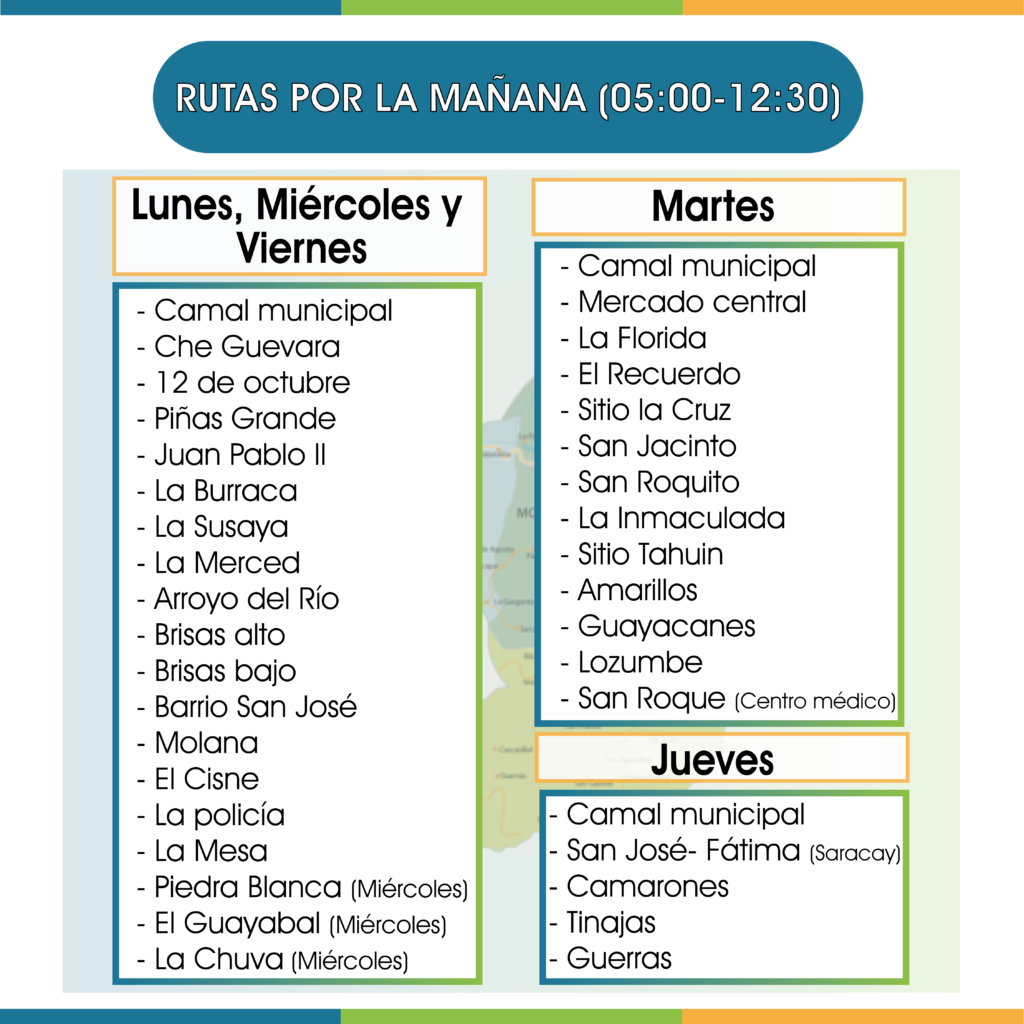 RECOLECTOR 3 | Camal Municipal Che Guevara Cdla. 12 de Octubre Parroquia Piñas Grande (calles de lastre) Cdla. Juan Pablo II Sitio La Burraca (detrás de gasolinera) Parroquia La Susaya Cdla. La Merced Calle Arroyo del Rio Cdla. Brisas Alto Brisas Bajo Barrio San José (hasta salida en Molana) Sitio Molana Cdla. El Cisne La Policía Sitio La Mesa Sitio Piedra Blanca Sitio El Guayabal Sitio La Chuva | Lunes Miércoles Viernes |