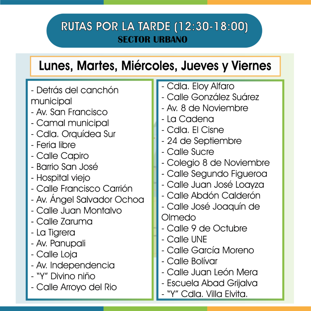 RECOLECTOR 2 | Canchón Municipal Av. San Francisco Camal Municipal Cdla. Orquídea Sur Feria libre Calle Capiro Barrio San José Hospital Viejo Calle Francisco Carrión Av. Ángel Salvador Ochoa Calle Juan Montalvo Calle Zaruma Av. Ocho de Noviembre La Tigrera Av. Panupali Av. Loja Av. La Independencia “Y” Divino niño Calle Arroyo del Rio Cdla Eloy Alfaro Calle Gonzales Suarez Av. Ocho de Noviembre Sector La Cadena Cdla. El Cisne 24 de Septiembre Calle Sucre Colegio 8 de noviembre Calle Segundo Figueroa Calle Juan José Loayza Calle Abdón Calderón Calle José Joaquín de Olmedo Calle 9 de octubre Calle UNE Calle García Moreno Calle Bolívar Calle Juan León Mera Escuela Abad Grijalva “Y” de la Cdla. Villa Elvita. | Lunes Martes Miércoles Jueves Viernes |