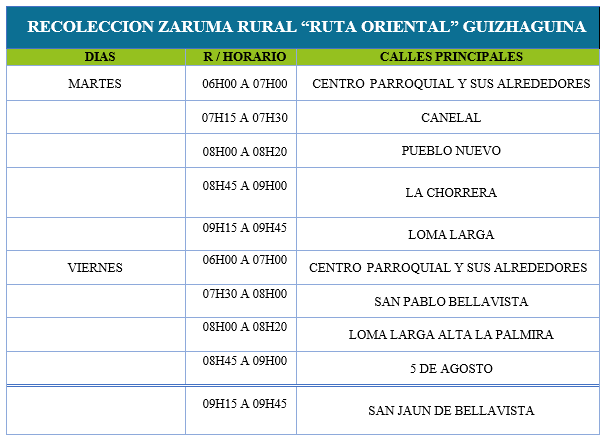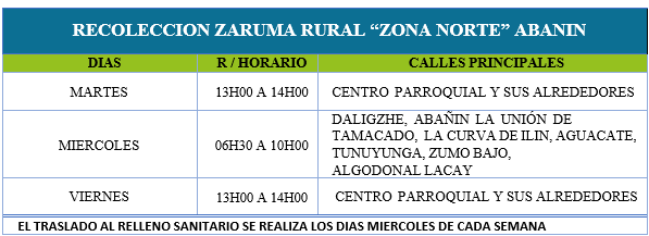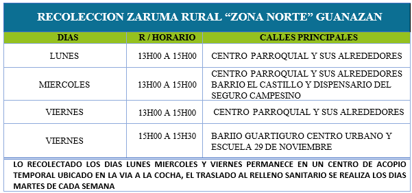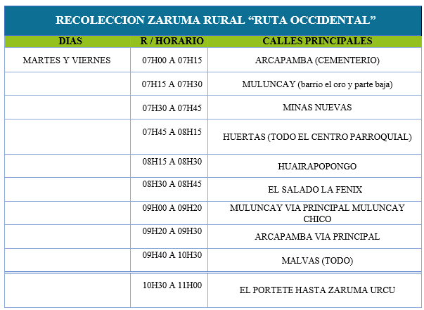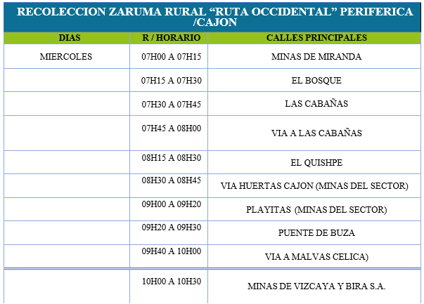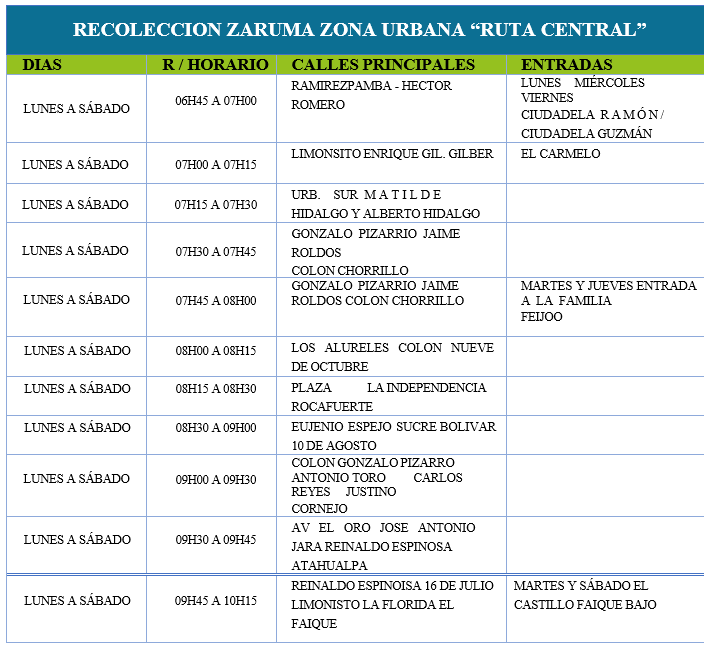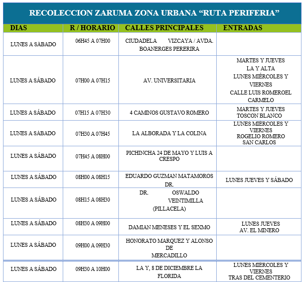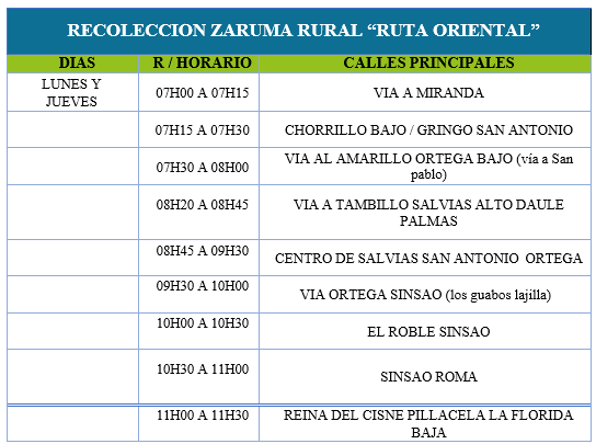 DÍAS, HORARIO Y RUTAS DE RECOLECCIÓN (ZARUMA)